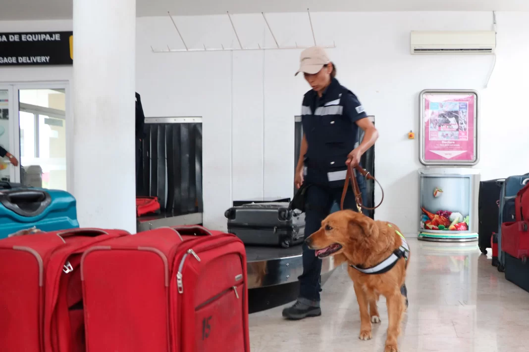 Para realizar esta labor, el Senasica cuenta con el apoyo de binomios caninos de inspección, que gracias a su extraordinaria memoria olfativa pueden identificar aromas como cítricos, manzana, mango, cerdo o res, sin necesidad de abrir el equipaje de las y los viajeros.