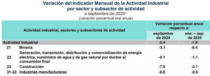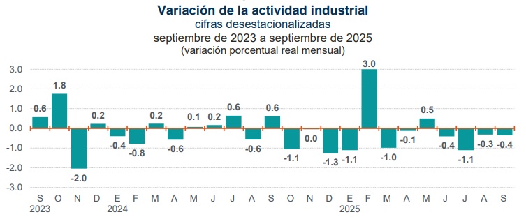 En línea con el débil desempeño de la economía mexicana, la actividad industrial del país “está en recesión”, pues en septiembre pasado registró una caída de -2.4 por ciento a tasa anual, con lo que en los primeros nueve meses del año el sector acumuló una contracción de -1.8 por ciento respecto al mismo periodo de 2024, de acuerdo con datos del Instituto Nacional de Estadística y Geografía (INEGI).