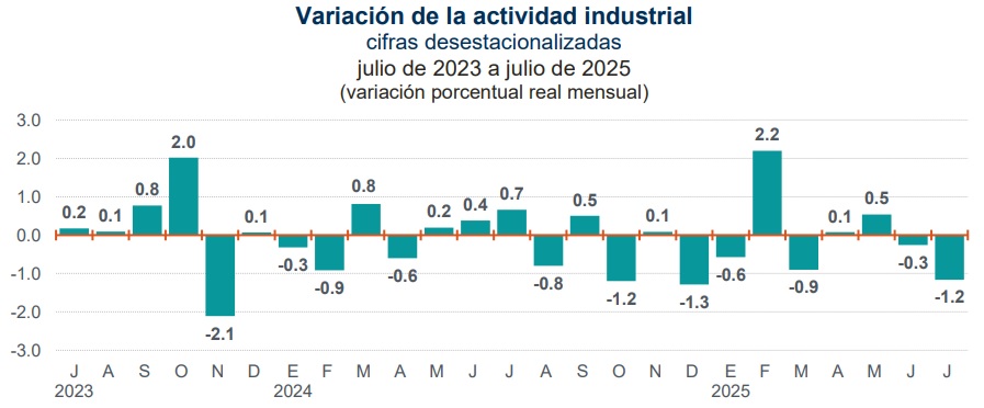 En sintonía con el pobre dinamismo que reporta la economía mexicana, la industrial en México se mantiene a la baja, pues el Instituto Nacional de Estadística y Geografía (INEGI), informó que durante julio de este año el sector fabril del país retrocedió -1.2 por ciento respecto a junio, con lo que a tasa anual se contrajo -2.7 por ciento.