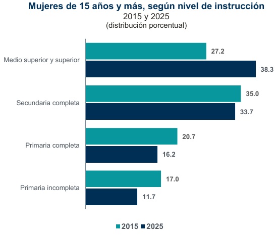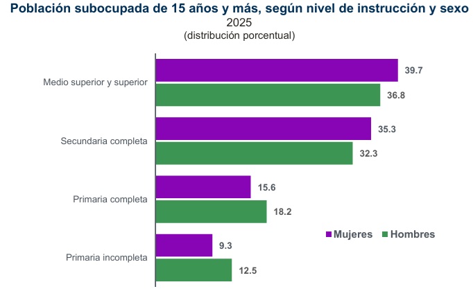 Entre las mujeres se observó una mayor subocupación en aquellas que contaban con niveles de instrucción medio superior y superior (39.7 por ciento) y con secundaria completa (35.3 por ciento), en comparación con los hombres con niveles de instrucción similares (36.8 y 32.3 por ciento, respectivamente).